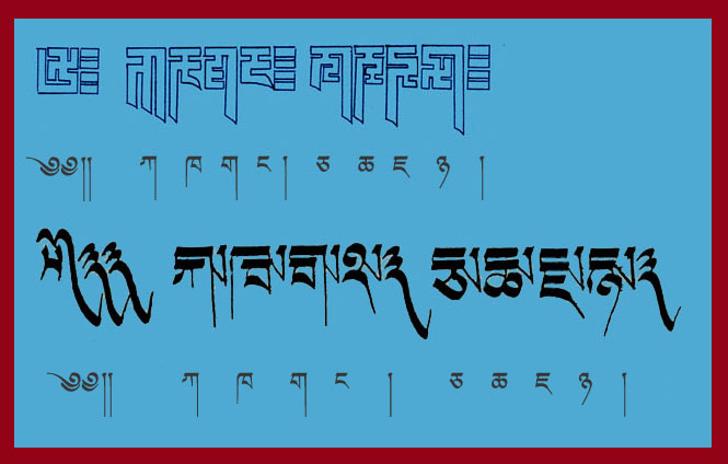 Above, a sample of Zhang Zhung mar chen. Below, a sample of Zhang Zhung mar chung. Both have the corresponding Tibetan script underneath. (Zhang Zhung fonts from the website: himalayabon.com)