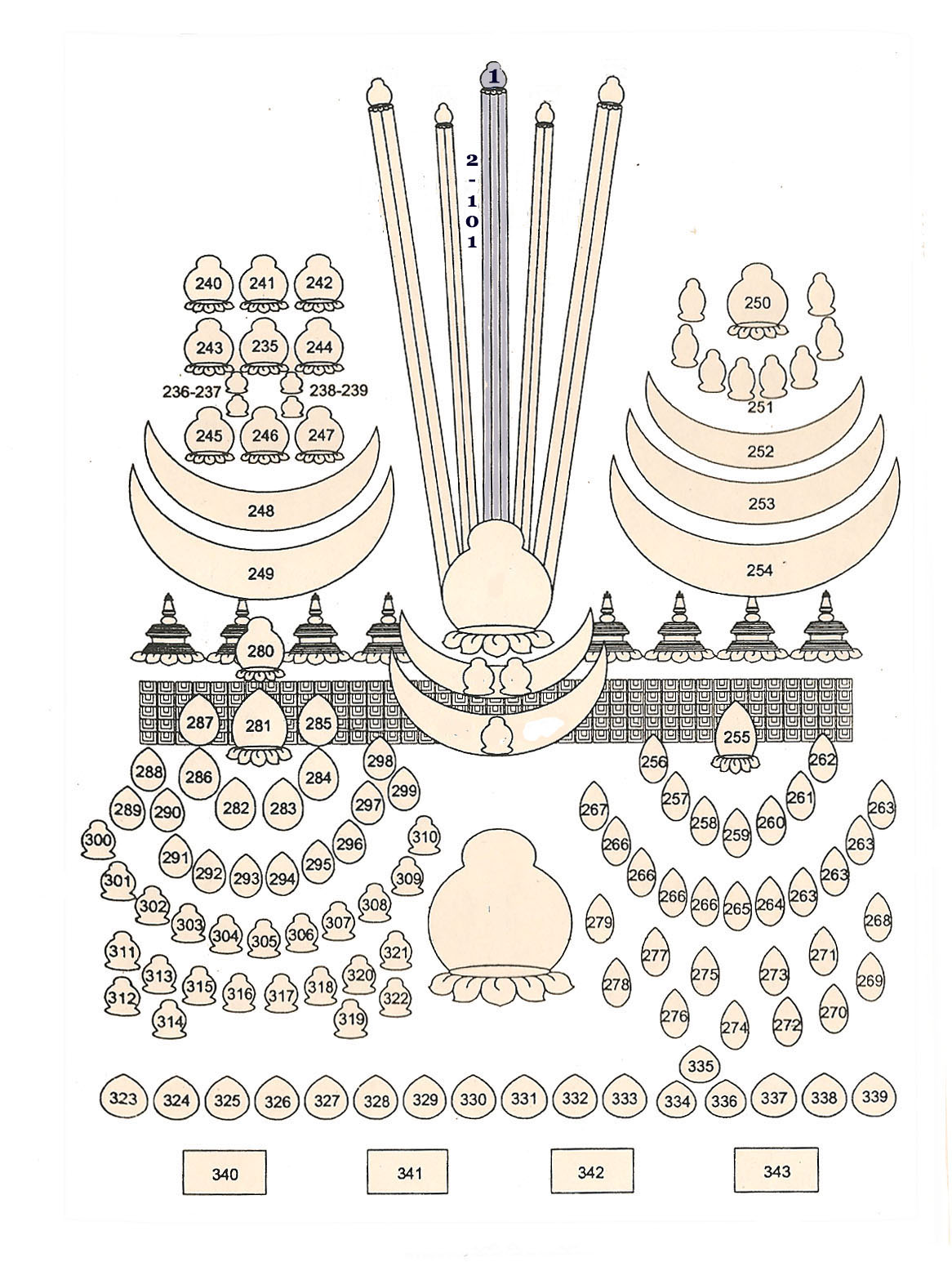 In the Yungdrung Bön tradition, the place where the deities and objects of veneration are gathered is called the “Tsok Zhing”, the “Field of Accumulation”. It is also sometimes translated as the “Field of Merit” or the “Merit Field” because what is being accumulated by paying homage and making offerings to this place is merit, or virtue. This is the Merit Field according to the Menri Tradition from a drawing done by the great master and scholar HE Yongdzin Tenzin Namdak Rinpoche.