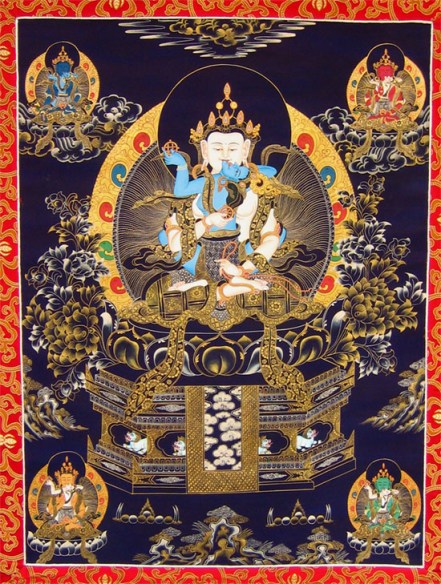 Here, the deities of the Five Buddha Families are positioned according to diagram 1 above. In the center is the Enlightened One, Künang Kyapa and consort. In the east is the Enlightened One, Salwa Rangjung and consort. In the north is the Enlightened One, Gélha Garchuk and consort. In the west is the Enlightened One, Jedrak Ngomé and consort. And in the south is the Enlightened One, Gawa Döndrup and consort.