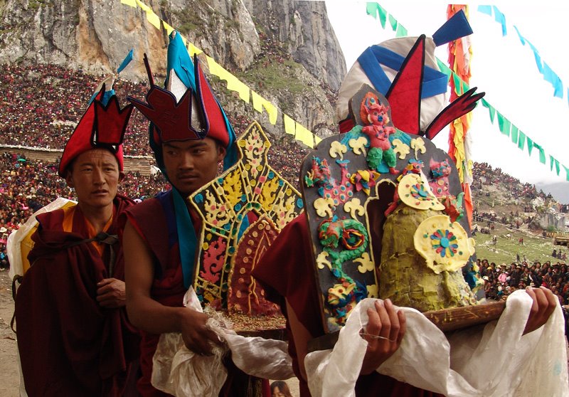 Yungdrung Bon monks carry ritual torma offerings during a tantric ritual in Tibet