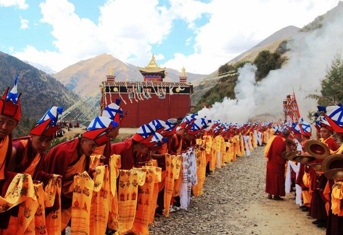Yungdrung Bon monks in Derge, Tibet welcome a visiting master
