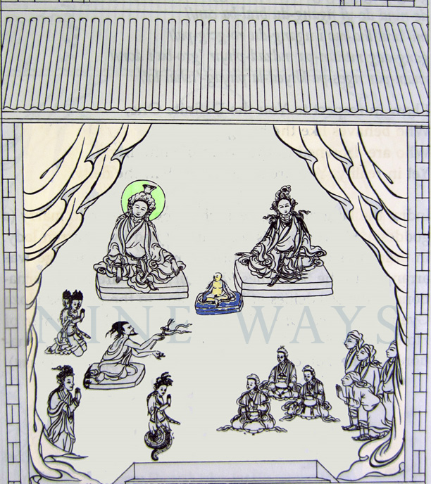 Although Buddha Tönpa Shenrap Miwoche was already a fully enlightened being and therefore has no worldly lineage, in order to continue the royal lineage into which he was born and in order to benefit sentient beings, he had ten children. The first born was his son, Tobu Bumsang. Auspicious signs occurred during each of the births and all of the children possessed the major and minor marks of an extraordinary being.