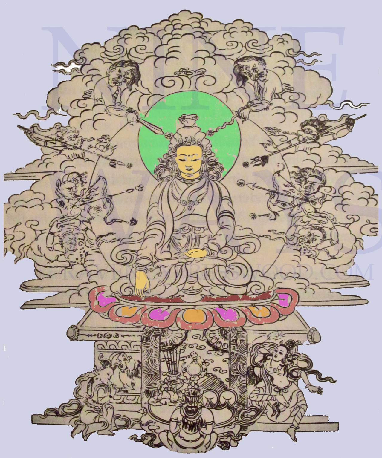 Helpless to continue the attack, the demon prince Khyappa Laring pretended to become a disciple as well. During the day, he appeared to be good and obedient, but at night he continued his activities of harm and destruction. He tried seducing the wives of Lord Tönpa Shenrap but failed. However, he managed to trick his daughter, Neuchung, by using a magical emanation of seven handsome youths that invited her to their kingdom. Internally, Neuchung had felt doubt about her father’s teachings and so went with the youths. The most handsome of the youths was actually the demon prince who seduced her and eventually took her as his prisoner. During this time, Lord Tönpa Shenrap was teaching in a god realm but was aware of the situation through his unobstructed clairvoyance. He sent an invisible emanation of himself in the form of a large garuda to watch over his daughter. Once realizing her error, her father had her returned to Olmo Lungring. There, she confessed her doubts and presented five offerings of light, incense, pure water, food, and flowers as an act of atonement.