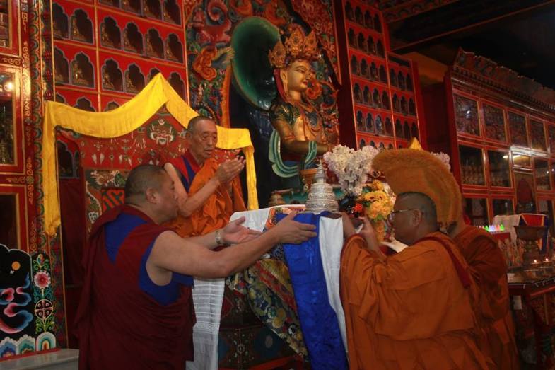 His Eminence Menri Lopon Thrinley Nyima Rinpoche offers a mandala representative of the entire universe to His Holiness 33rd Menri Trizen Rinpoche upon his return to Tashi Menri Monastery in Dolanji, India. Photo credit: Unknown
