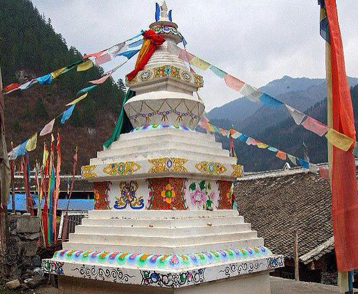 The Higher Levels of the Altar: It is important to have representations of enlightened Body, Speech and Mind on the altar. Enlightened Body is represented by statues and images such as thangkas, enlightened Speech is represented by texts, and enlightened Mind is represented by the chorten. Yungdrung Bön scriptural texts are always placed in the highest possible position with nothing on a level above them. They are considered even more important than an image of the Buddha because they contain the actual teachings and guidance that leads sentient beings out of their suffering. Sometimes they are placed on the same level with the deity statues due to limited space.