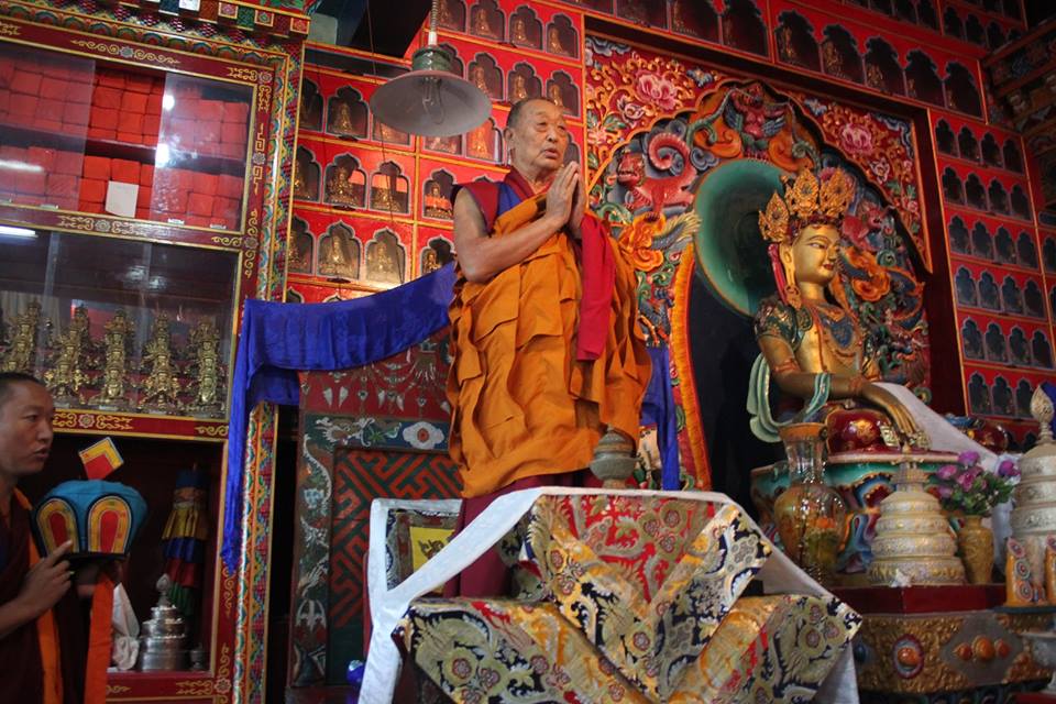 HH 33rd Menri Trizen. Behind him and to the left are texts wrapped in red cloth on shelves above the deity statues. Photo Credit: Unknown.