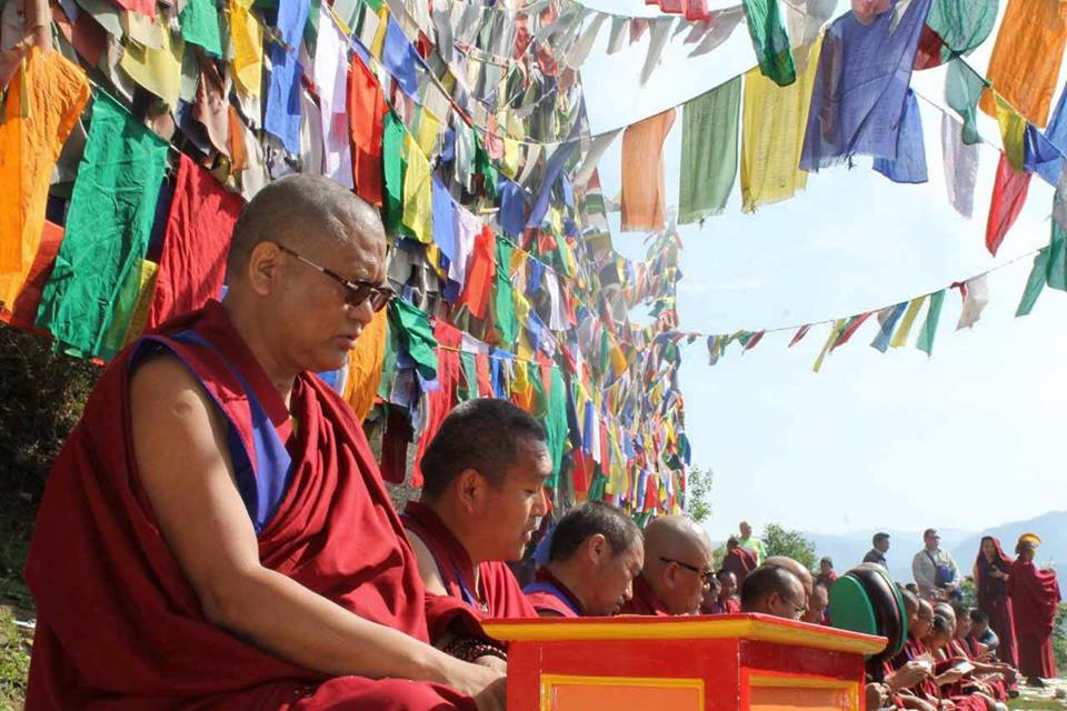 HE Menri Lopon Thrinley Nyima Rinpoche leads a ceremony at Menri Monastery in India. Photo credit: Unknown