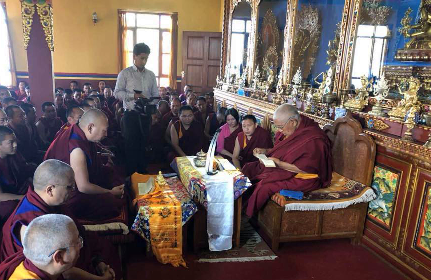 His Holiness 34th Menri Trizin Rinpoche receives blessings and transmissions from Yongdzin Tenzin Namdak Rinpoche at Triten Norbutse Monastery in Nepal March 2018. Photo credit: Unknown.