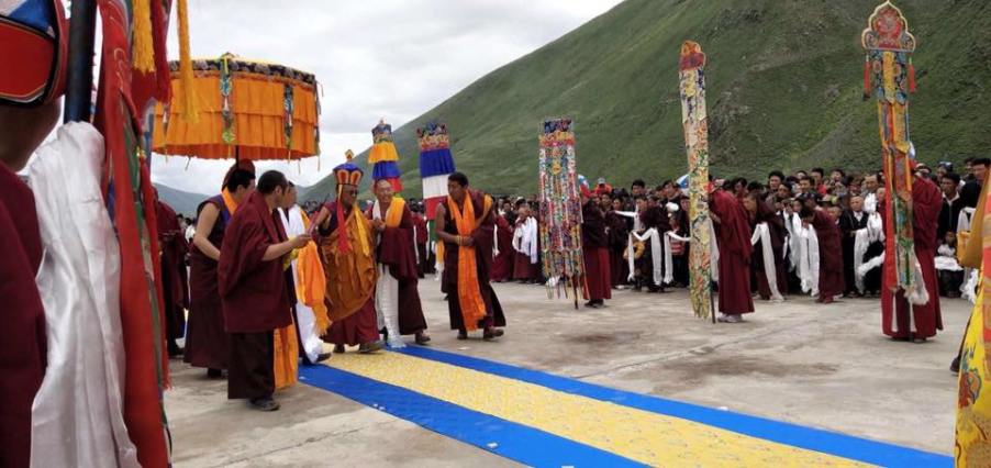 His Eminence Menri Ponlop Yangton Trinley Nyima Rinpoche being welcomed at Gangru Dargye Monastery in Kham, Tibet. Photo credit: Unknown.