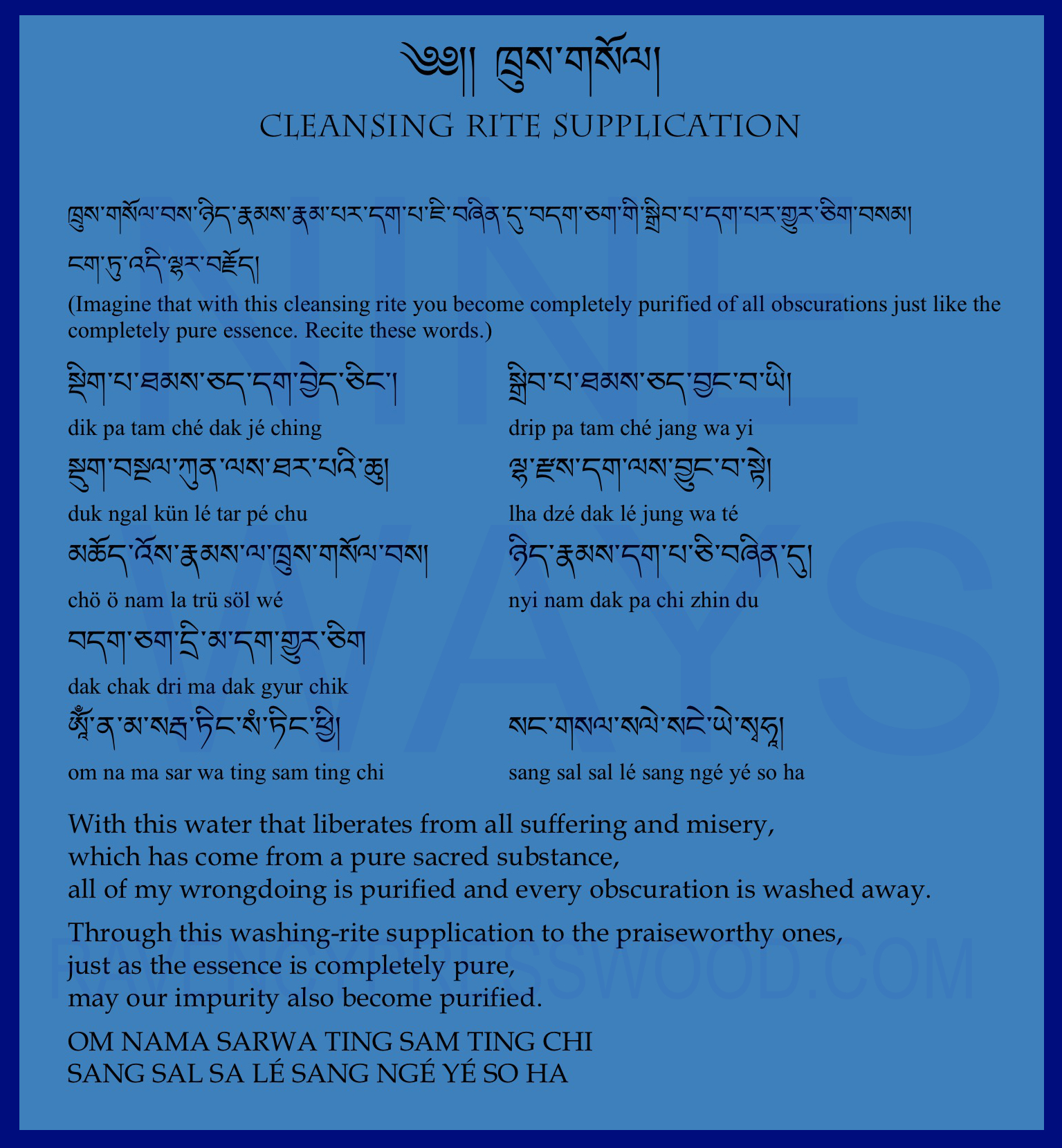 “Anyone affected by contaminated energy, latent karmic potentialities, misfortune or defilements, having recited the mantra into clean water and ritually washed, even karmic defilements will be purified.”