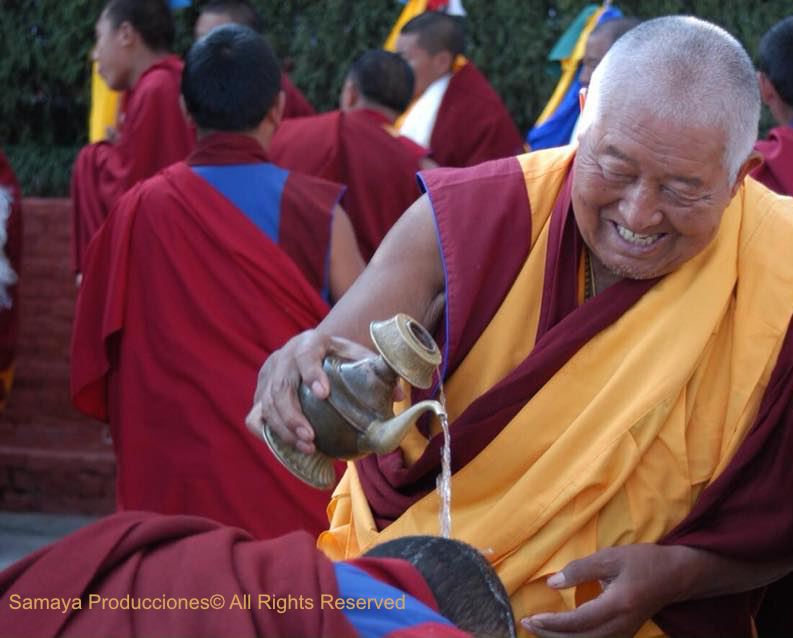 H.E. Yongdzin Tenzin Namdak Rinpoche offers cleansing water to a monk at Triten Norbutse Monastery in Nepal. Photo credit: Samaya Producciones.