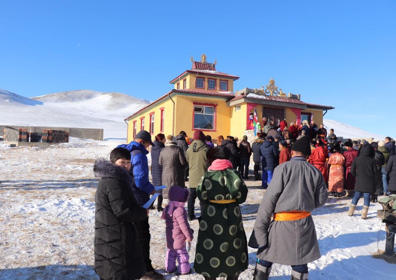 The public looks on as HE Menri Ponlop Rinpoche officially opens the new temple in Mongolia. Photo credit: Unknown