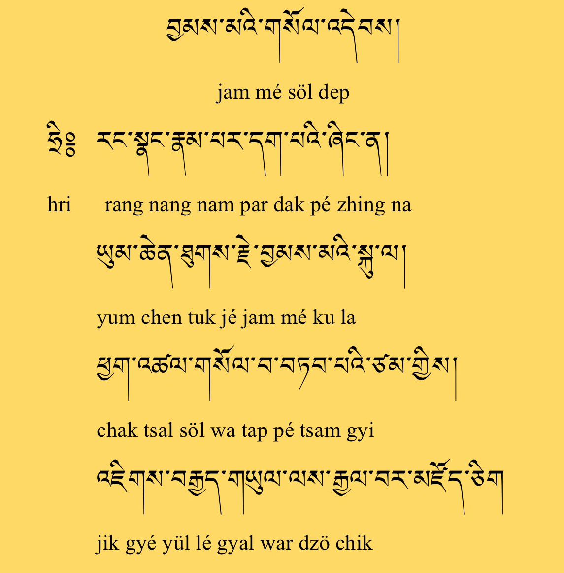 Audio for the Tibetan language chanting has been kindly recorded and posted to Facebook by Geshe Yongdong, president and spiritual director of Sherab Chamma Ling. Check his page for the recording.