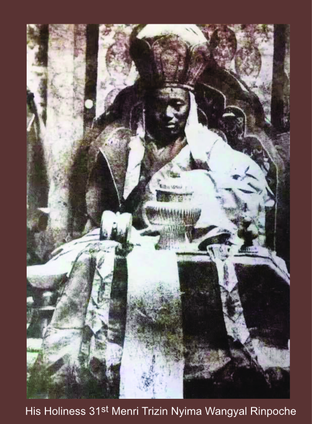 His Holiness the 31st Menri Trizin Khen Chen Nyima Wangyal Rinpoche (1910-1954) was born in Gyalrong, Tibet. As Menri Trizin, he sanctioned the construction of a new college and reformed the curriculum. He passed away at the age of 45 in the Western calendar year of 1958.