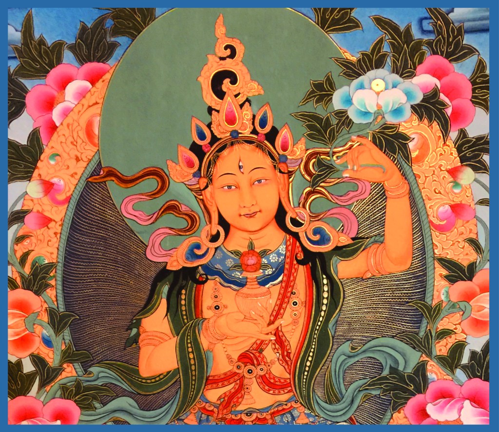 Sixth is the ground of realizing bliss. Upon the ground of realizing bliss, having cleansed and purified the stain of being weak and with little capacity, and having perfected the great accumulation of power, may I see the face of Topkyi Jamma, the Loving Mother of Power!