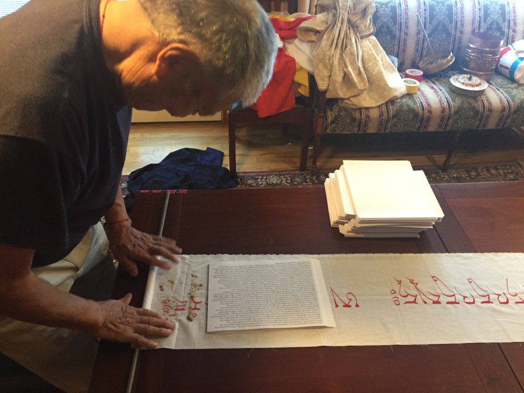 The mantric cloth is laid out. Because a Yungdrung Bön prayer wheel is rotated counter-clockwise, all of the prayers and mantra face inward towards the sok shing and rolling begins from the end and moves toward the beginning of the mantric cloth. Buddhists prayer wheels are rotated clockwise and so the prayers and mantra face outward. Therefore, the sok shing is placed at the end of the cloth and/or roll of paper and mendrup is added. Shardza Rinpoche also suggests adding the powder of precious jewels. While being sure to keep track of the top of the prayers, the rolling begins. Everything is rolled tightly so that it is very secure. Once the rolling is complete, it is tied or taped in place. Shardza Rinpoche advises writing a head letter with the syllable OM on the outside of the mantric cloth in order to know the correct orientation of the roll. Then, according to Shardza Rinpoche,