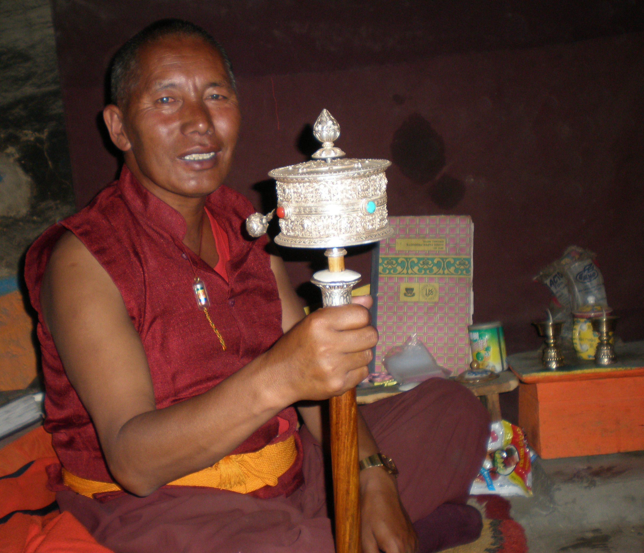 Prayer wheels that are turned by fire are quite common. Rolls of prayers and mantra are properly prepared and placed inside a cylinder that is positioned above a butter lamp or candle. The rising heat from the flame provides the energy needed to turn the cylinder. By necessity, these prayer wheels are often small and light. In modern times, small prayer wheels have been created that are turned by energy generated from a solar panel. Prayer wheels that are turned by water are also common. They are placed above rivers and streams with the central pillar extending below the roll of prayers and into the moving water. Attached to the bottom of the central pillar are rotating blades or wheels of various designs that turn with the force of the water. Depending upon the strength of the water, these type of prayer wheels can be quite large. They are always placed within a so-called “prayer wheel house” that provides protection for the printed prayers and mantra from the natural elements. Wheels that are turned by the air are another common type of prayer wheel. Families will often place many of these types of prayer wheels around the home for blessing and protection. These wheels are relatively small, and lightweight blades are placed at the top or bottom of the prayer wheel in order to catch the wind and cause the prayer wheel to rotate. Although Shardza Rinpoche mentions prayer wheels that are turned by the earth in his essay, I have been unable to find an example of this, and the Tibetans that I spoke with had never seen or heard of them.