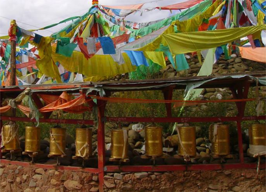 Once the prayer wheel is dressed with brocade or cloth of the five elements, it is ready to be installed according to its particular type. If they are installed in the environment, they should be protected. If they are used as a handwheel, the handle is generally held with the right hand because the tengwa, or prayer mala, has to be held with the left hand. (For more information about using a tengwa, see previous post: https://ravencypresswood.com/2021/07/24/tengwa-meaning-origin-and-proper-use-of-the-prayer-beads-of-the-yungdrung-bon/) In this way, a practitioner can turn the prayer wheel and recite mantra simultaneously. A handheld prayer wheel should always be kept clean, not placed directly on the ground, or put onto shelves or tables along with other ordinary objects. In the words of Shardza Rinpoche: