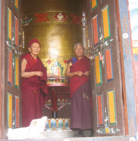 Prayer wheels that are turned by fire are quite common. Rolls of prayers and mantra are properly prepared and placed inside a cylinder that is positioned above a butter lamp or candle. The rising heat from the flame provides the energy needed to turn the cylinder. By necessity, these prayer wheels are often small and light. In modern times, small prayer wheels have been created that are turned by energy generated from a solar panel. Prayer wheels that are turned by water are also common. They are placed above rivers and streams with the central pillar extending below the roll of prayers and into the moving water. Attached to the bottom of the central pillar are rotating blades or wheels of various designs that turn with the force of the water. Depending upon the strength of the water, these type of prayer wheels can be quite large. They are always placed within a so-called “prayer wheel house” that provides protection for the printed prayers and mantra from the natural elements. Wheels that are turned by the air are another common type of prayer wheel. Families will often place many of these types of prayer wheels around the home for blessing and protection. These wheels are relatively small, and lightweight blades are placed at the top or bottom of the prayer wheel in order to catch the wind and cause the prayer wheel to rotate. Although Shardza Rinpoche mentions prayer wheels that are turned by the earth in his essay, I have been unable to find an example of this, and the Tibetans that I spoke with had never seen or heard of them.