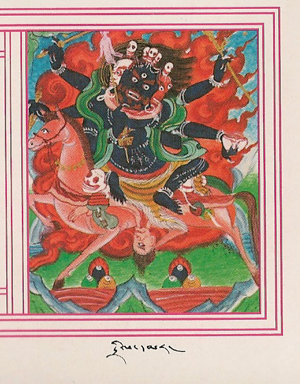 Her tülku manifestations appear with a dark blue body with three faces, six arms and riding either a black mule or a red mule. She can manifest in whatever way is necessary to give her protection and support.
