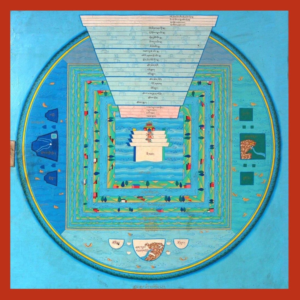 - Mt. Meru-At the center of the world system is Mt. Meru. Some compare Mt. Meru to Gang Tisé a.k.a Mt. Kailash. They share similarities, for example, Mt. Kailash has four sides and is the source of four great rivers. However, Mt. Meru is not a physical place as such and cannot be visited or perceived by ordinary beings whose pure perception is obscured by the five poisons. At the very center of Mt. Meru is the palace of Nampar Gyalwa. The mountain is equally above and below the surface of the ocean.