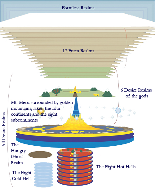 The layout of one world system within the three thousandfold universe is depicted two dimensionally as a vertical arrangement of phenomenal existence. However, the limitations of this kind of representation should be kept in mind. For example, the uppermost four levels of a world system are the four formless realms. These realms and their inhabitants do not have actual, physical form or precise location. So, to represent the formless with a form can be misleading unless it is understood simply as a reminder of the of their actual characteristics. And although each categorized element of the universe has detailed subcategories within subcategories, a general description is sufficient to relay the scope and overall idea.