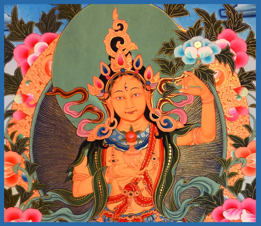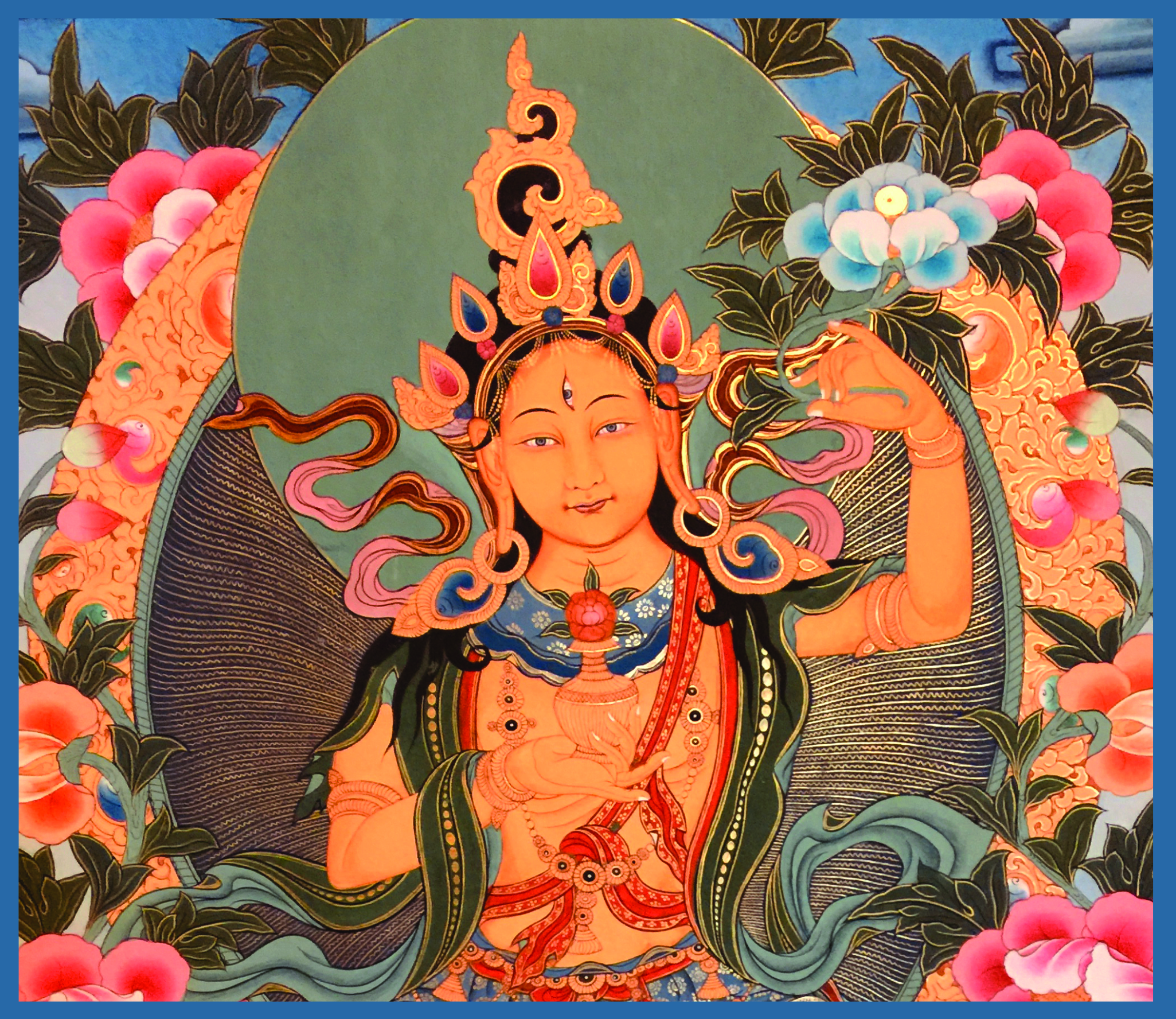 “She is the source of the essence of wisdom, as well as the source of the natural mind of all the enlightened ones. She is the empty aspect of space in which everything is arising, everything is abiding, and everything is dissolving. She is the essence of absolute reality. In order to lovingly care for all sentient beings like a mother cares for her only child, she engages in supreme activity by guiding in the manner of a goddess. She is the great mother who has given birth to all the buddhas of the three enlightened bodies, all of whom possess the defining characteristics of having conquered both the two obscurations and all karmic potentialities, as well as being buddhas of the three times of past, present and future.”