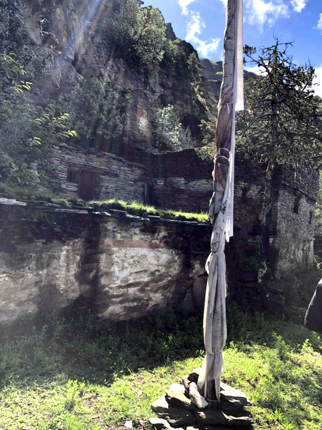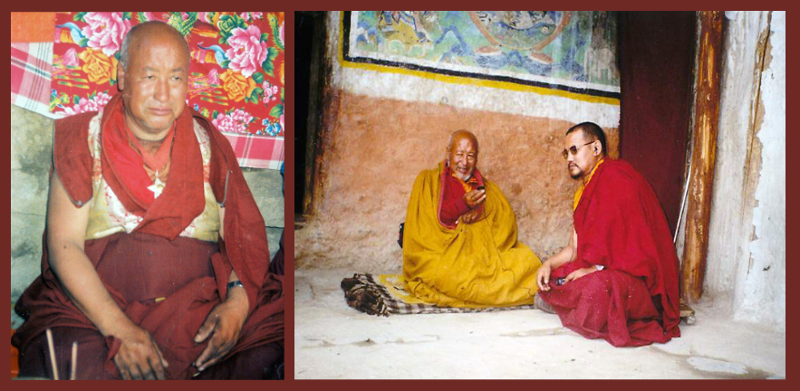Upon his return to Barlé village, he immediately began looking for an isolated spot to go into retreat. He found an auspicious place about a thirty-minute walk from Barlé Gompa near a rock formation that naturally resembled a chorten. Here, he constructed Drak Gön Hermitage, Stone Temple Hermitage. From 1970 until 2000, he remained in retreat at this hermitage while also working for the benefit of the local residents. He was a skilled calligrapher and wrote many hundreds of pages of sacred text by hand. At the end of his life, he gave many of these texts, to Murig Khenpo Nyima Künchap Rinpoche who was both his relative and a close student from a young age.