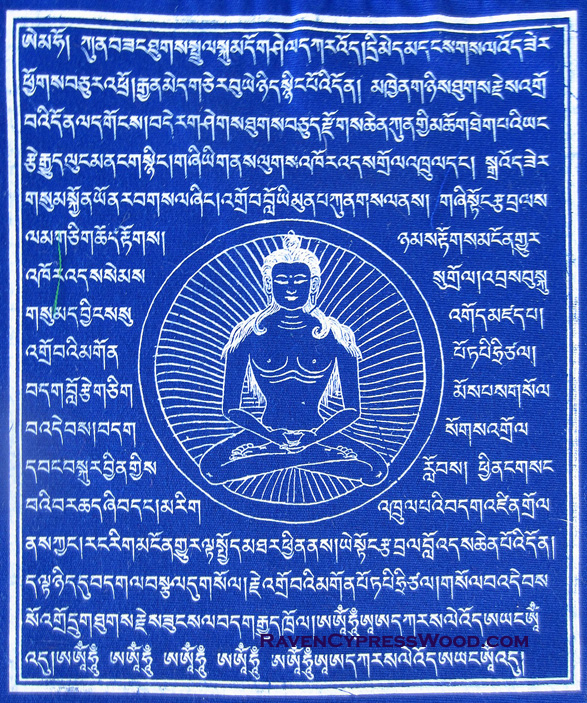 This Yungdrung Bön prayer flag has a center image of Tapihritsa. He was an historical person of the 8th century who attained full realization and is seen as being merged with the primordially enlightened Küntu Zangpo. Tapihritsa is an important figure in the lineage of the Zhang Zhung Aural Tradition of Dzogchen. The direct lineage of this tradition was never interrupted in any way and continues to this very day.