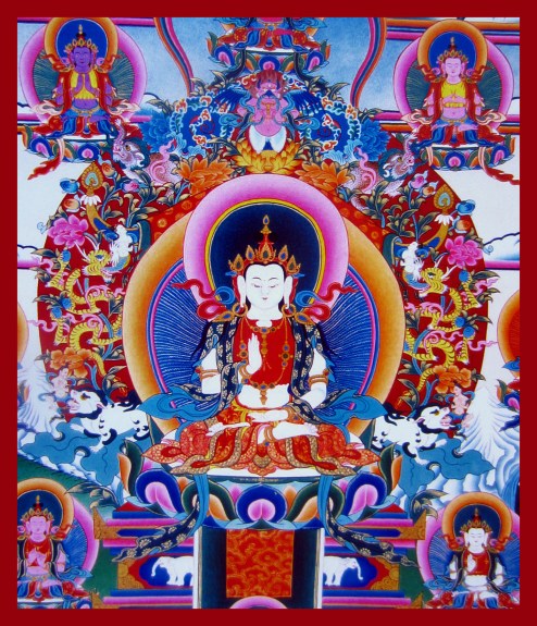 247. Jamden Rangma Médron. This Enlightened Being is prophesized to be the Buddha of the Future and will appear in this world when the human life-span has declined to be only 10 years long. He was the younger brother of Tönpa Shenrap Miwo in the celestial realm. He is depicted upon a throne held aloft by elephants and seated upon cushions of a sun, moon, and lotus. His right hand is held in a mudra of contemplation at the center of his heart and his left hand is held in the mudra of equipoise. His body is the color of clear crystal and upon his head is a crown of precious jewels.