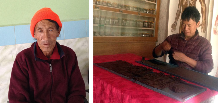 Left: Amchi Yuthok Tsewang, Amchi Nyima’s father. Right: Amchi Nyima preparing medicine. Photo credit: Unknown