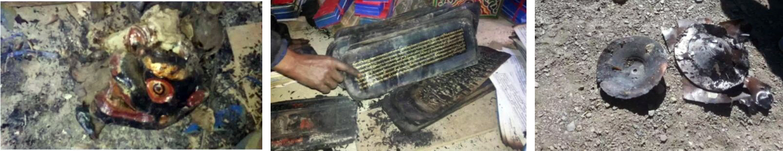 Because the head lama’s house is located some distance from the temple, the fire was not noticed until the flames were visibly engulfing the structure. Everything was destroyed. In addition to the many ritual items such as sacred masks and drums, the temple contained many old, handwritten scriptures. Some of these old scriptures had been written with ink of gold.