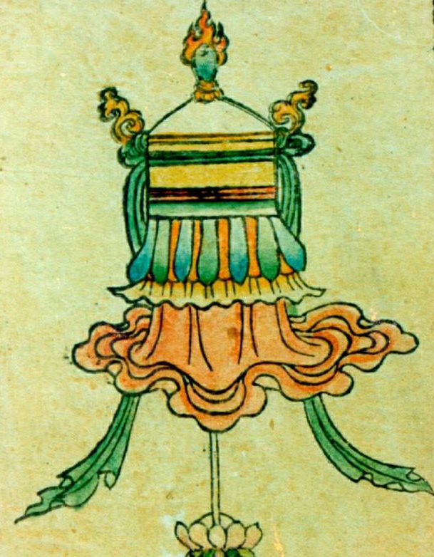 The founder of the Yungdrung Bön religious tradition, Buddha Tönpa Shenrap Miwoche showed the path of renunciation by becoming a monk at the age of 31. This was his ninth deed. (For more information about the Buddha’s ninth deed, see previous article: https://ravencypresswood.com/2017/06/24/buddha-tonpa-shenraps-ninth-deed/ ) At his ordination, the six kinds of garments for a Yungdrung Bön renunciant fell from the sky. One of these garments was the lotus hat.