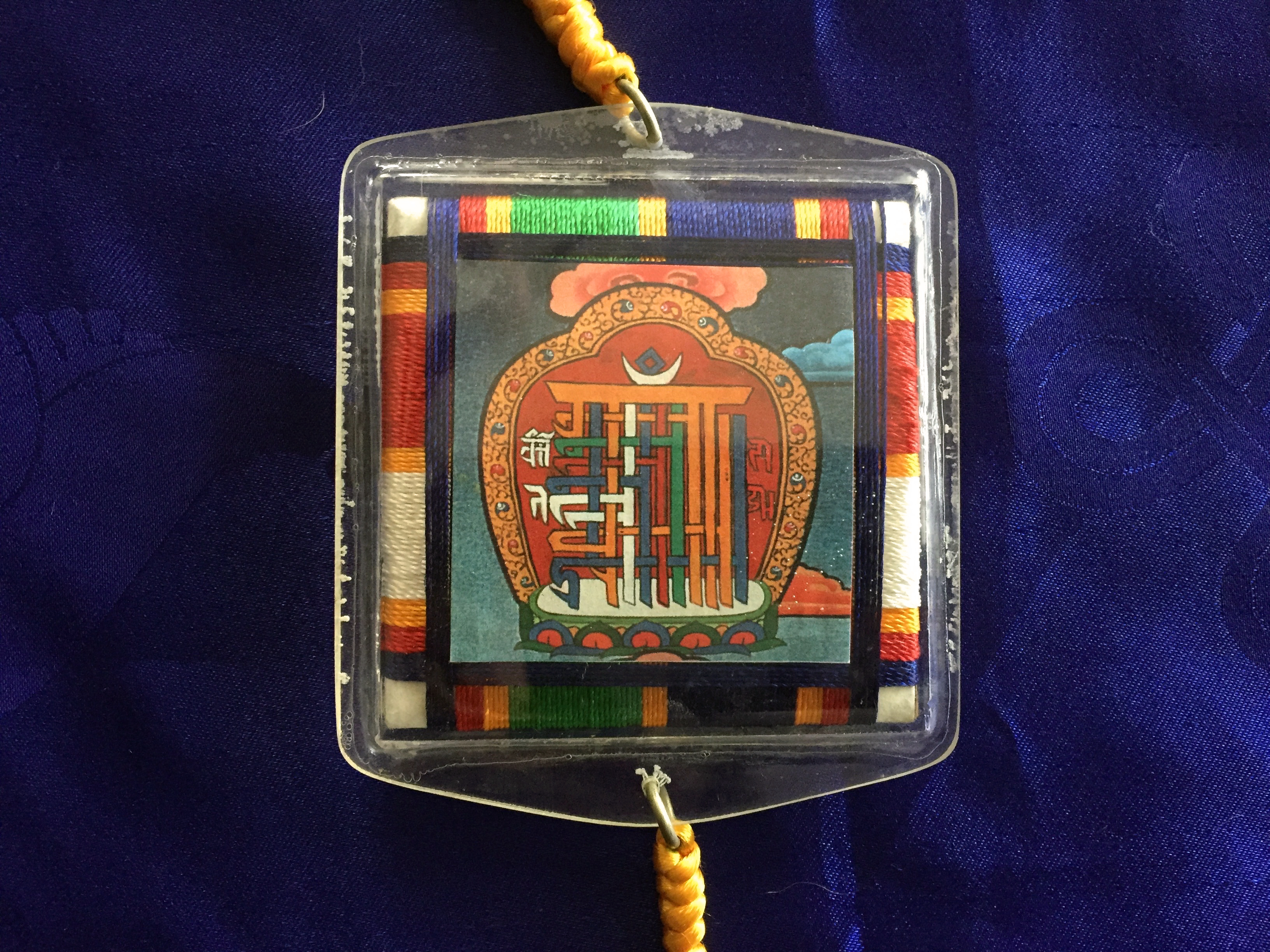 The long, thin strips of cloth that hang from the base of the hat near the ears are not mentioned within the texts. Therefore, the esteemed Yungdrung Bön spiritual master and scholar His Eminence Yongdzin Tenzin Namdak Rinpoche has stated that although it has become traditional to add them to the hat, they are not needed. Because of this, he sometimes takes these strips of cloth and places them inside the hat before putting it on.