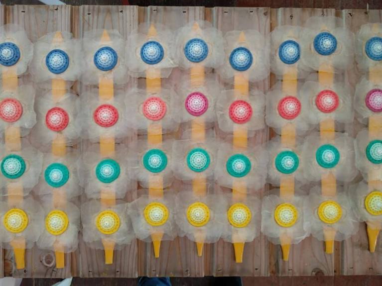 Within the Yungdrung Bön religious tradition, the lotus hat is worn by those who have received the full ordination of a renunciant. The shape of the hat resembles a full, blue lotus. In general, it represents the purity of perfecting the rules of completely pure discipline. It is surrounded by either four, six or eight lotus petals that represent purification throughout the four directions. The thread which holds the lotus petals to the hat represents the activity of subduing throughout the intermediate directions. The twenty-five pleats represent the enlightened state of the five buddha families. At the crown of the head, there is an opening to attach the crown ornament which extends from the hat towards the sky.