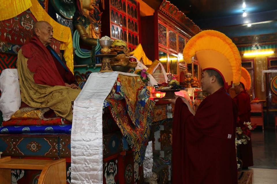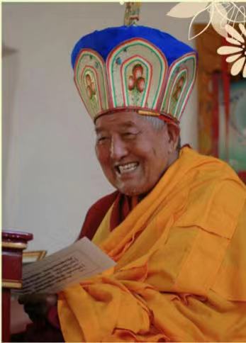 HE Yongdzin Tenzin Namdak Rinpoche wearing a lotus hat with the strips of cloth hidden underneath. Photo credit: Unknown