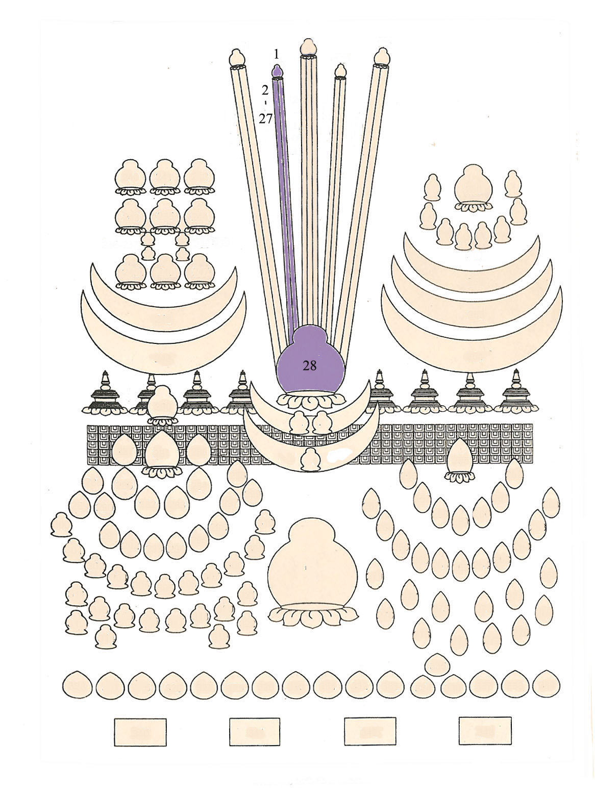In the Yungdrung Bön tradition, the place where the deities and objects of veneration are gathered is called the “Tsok Zhing”, the “Field of Accumulation”. It is also sometimes translated as the “Field of Merit” or the “Merit Field” because what is being accumulated by paying homage and making offerings to this place is merit, or virtue. This is the Merit Field according to the Menri Tradition from a drawing done by the great master and scholar HE Yongdzin Tenzin Namdak Rinpoche.