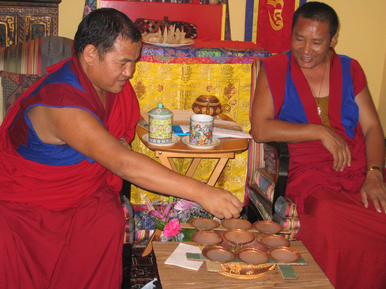 Geshe Nyima Künchap and Geshe Tenzin Yeshé prepare nine bowls for the water offering, or chutor. Photo credit: Raven Cypress Wood