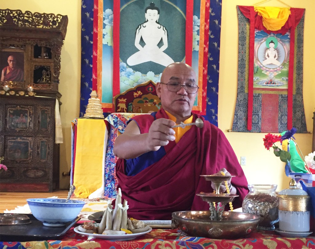 Geshe Nyima Künchap performs the water torma offering for the lu. Photo credit: Raven Cypress Wood