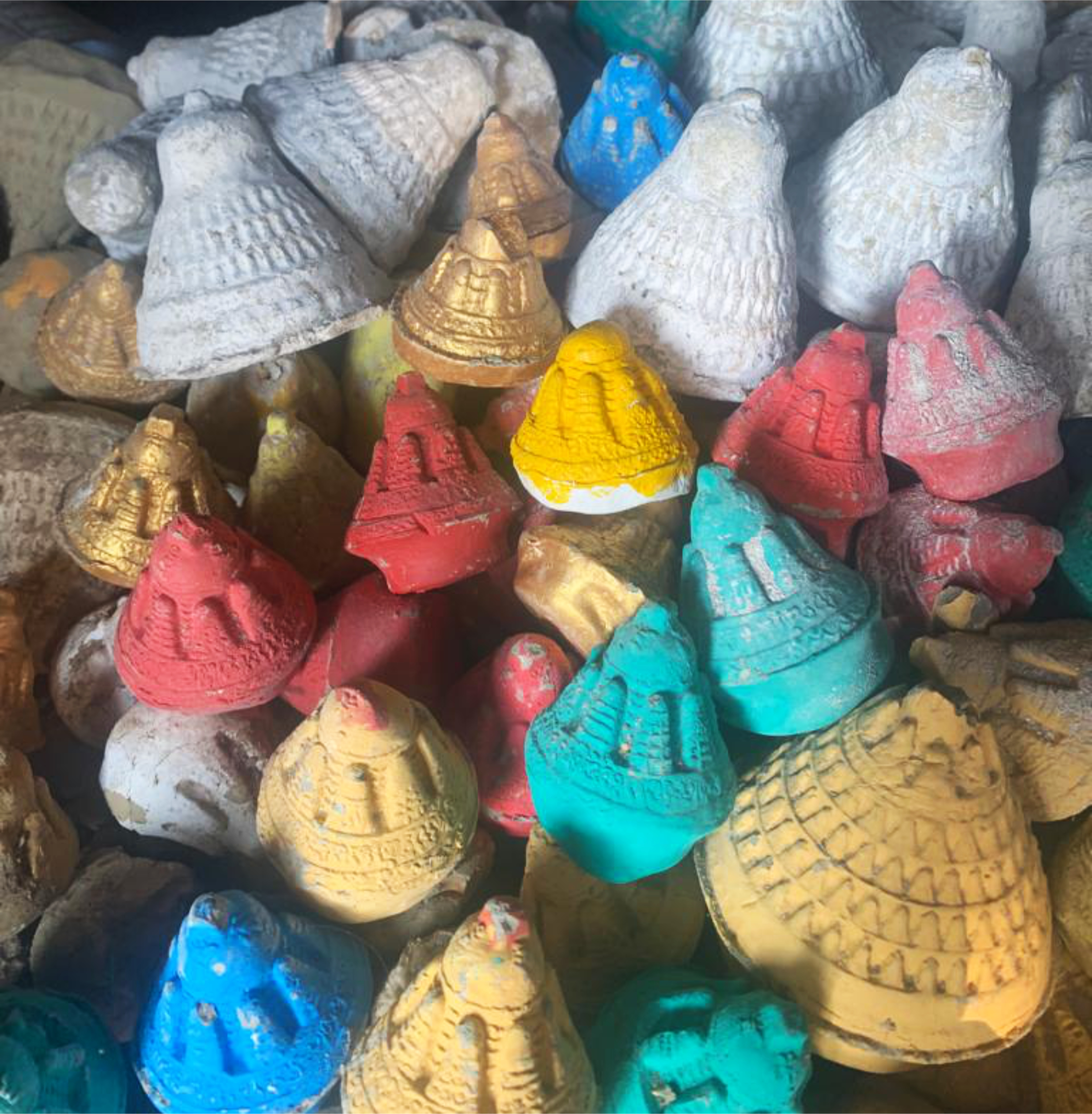 Made from a preformed mold, tsa tsa are small replicas of a chorten (Sanskrit: stupa) or enlightened being that are made for various purposes depending upon the mantra and substances places inside as well as the location of their final placement. Within The Way of the Genyen, the primary purpose for creating tsa tsa is for the accumulation of merit and wisdom. There are primarily three kinds of tsa tsa that can be created and offered depending upon the element used. Sa tsa are made with clay, the element of earth. Chu tsa are made with the element of water. Lung tsa are made with the element of wind. Sa tsa require more steps since their creation involves finding, cleansing, purifying, forming, and painting the clay. For each of these three kinds of tsa tsa, the purpose for offering, the recipients of the offering, and dedicating the merit of offering are the same.