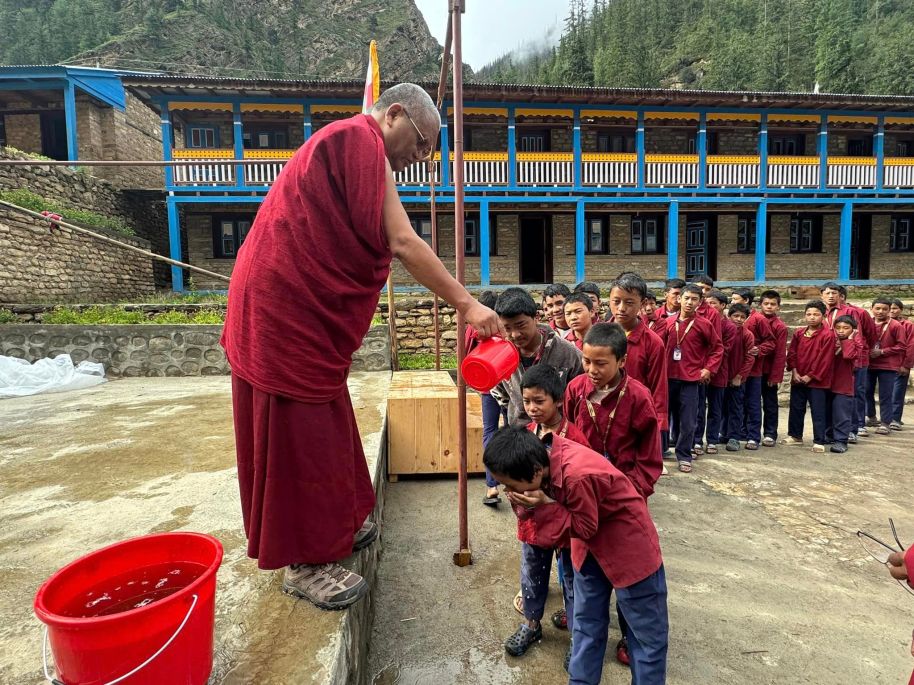 His Eminence Menri Yongdzin Pönlop Yangtön Thrinley Nyima Rinpoche gives lustral water to the school children of the Tapriza School in Dolpo, Nepal.