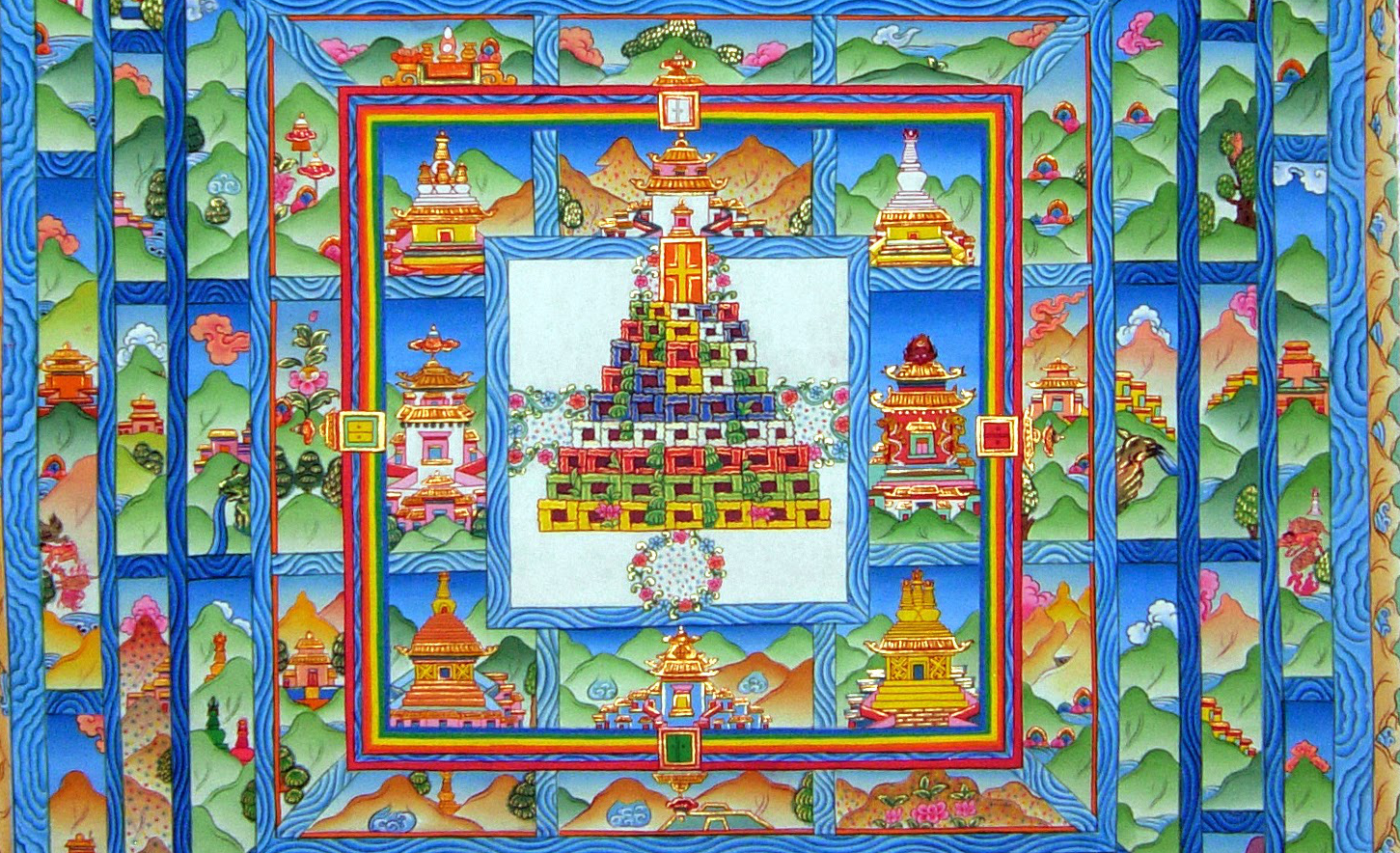 The Elegant Indestructible Chorten that was built in the mystical land of Olmo Lungring according to the Teacher’s instructions was to be used as a temple for his teaching. It was grand and extraordinary in every way. It had beautiful details such as golden pillars, turquoise beams, and bright images of lotuses, rainbows, clouds, and stars. Each part of the chorten’s structure and decoration was meaningful and created according to the detailed direction of the Teacher. It was constructed by a group of gods, lu, and human beings who were motivated by performing acts of virtue. They completed the work in fifteen days. Then, the Teacher performed an extensive consecration and gave it the name “Yungdrung Kolek Chorten, The Elegant Indestructible Chorten.” Then, once the assembly had gathered within the chorten, he began teaching the specific vows and practices for those who take vows according to The Way of the Genyen.