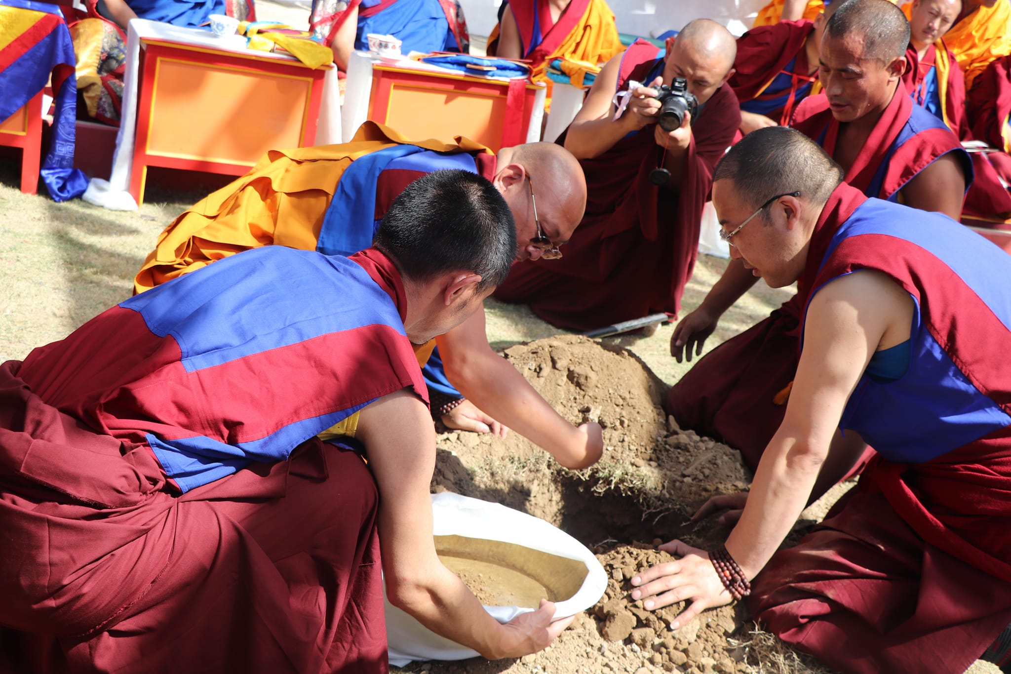 His Holiness the 34th Menri Trizin ritually breaks the ground in order to obtain soil for the mandala of the deities