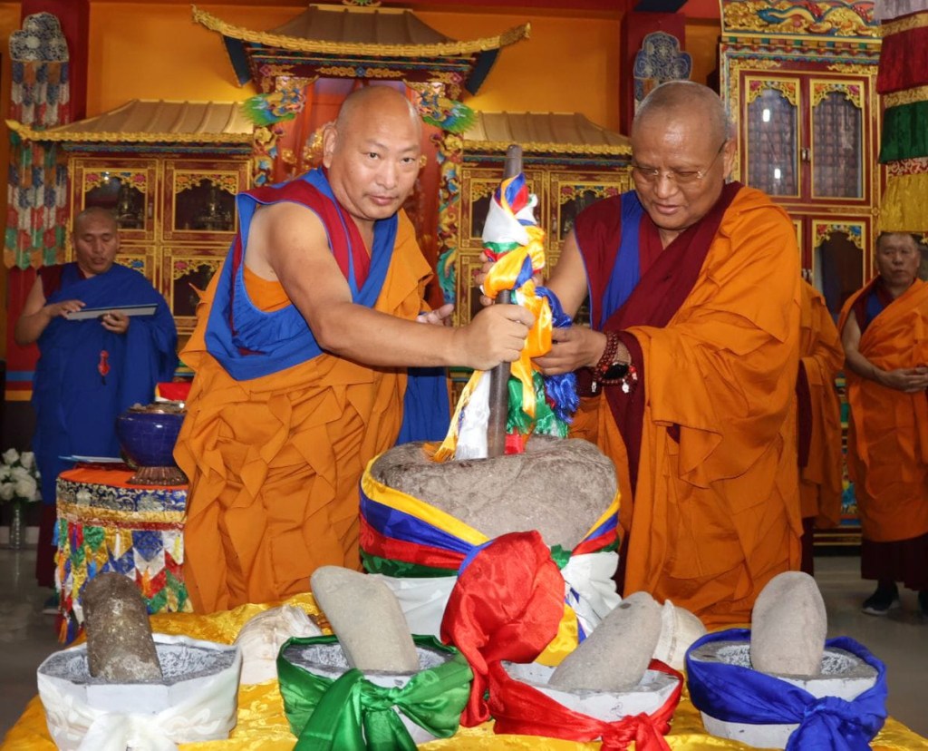 After the time of strong persecution had passed, it is said that the text was brought out of hiding along with vessels of mendrup in 1108 C.E. by Rikdzin Chenpo Gyermi Nyi Ö. This was passed to the the 4th abbot of Yeru Wensaka, Nyima Gyaltsen Rinpoche. From that time until the destruction by flood of Yeru Wesanka, the mendrup retreat was performed once in the lifetime of eighteen abbots of Yeru Wensaka. Having received the transmissions and empowerments for the mendrup cycle, the founder and 1st abbot of Menri Monastery recovered the texts and the mendrup and used them to begin the tradition at Tashi Menri Monastery in Tibet. One of the most important mendrup ingredients is a small amount of the blessed medicine that was created in previous mendrup retreats and safeguarded to be used as an ingredient in subsequent mendrup rituals. In that way, every mendrup contains some amount of mendrup from ancient times.