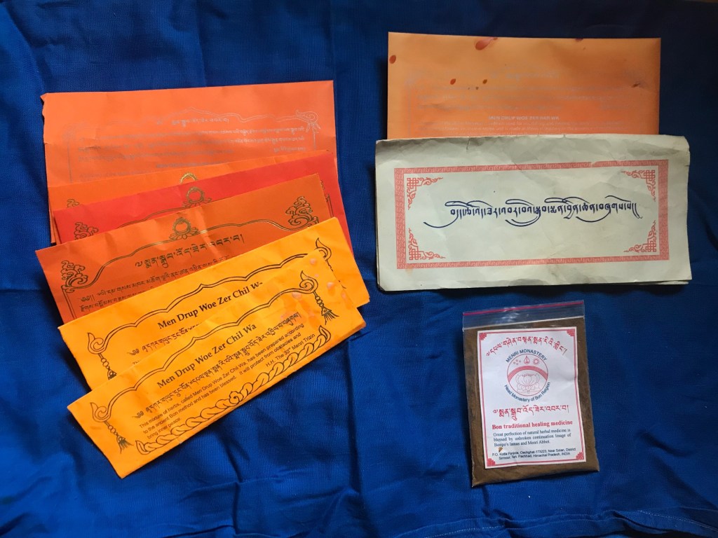 The Tibetan term mendrup [Wylie: sman sgrub] is a compound of two words: “men” generally meaning medicine, and “drup” meaning to accomplish or to achieve. Thus, the purpose of the ritual is create a medicine which is a consecrated and empowered panacea for both inner and outer ills and disturbances rather than a medicine for a specific illness. The final product is a consecrated and blessed, finely powdered substance that is distributed for free to the ordained, to laypersons, and to the general public. This blessed medicine is ingested orally, worn as a protective amulet, used as an offering, and included as an ingredient in many other rituals within the Yungdrung Bön religious tradition.
