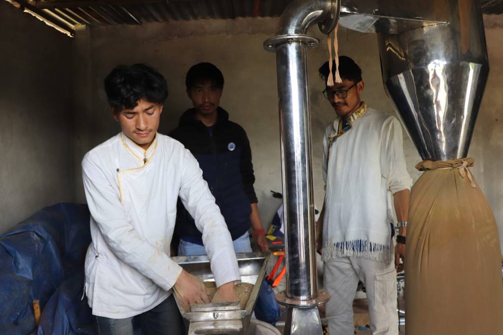 The Medical College of Sorig Bum Zhi Menri Ling grinding and processing the mendrup ingredients