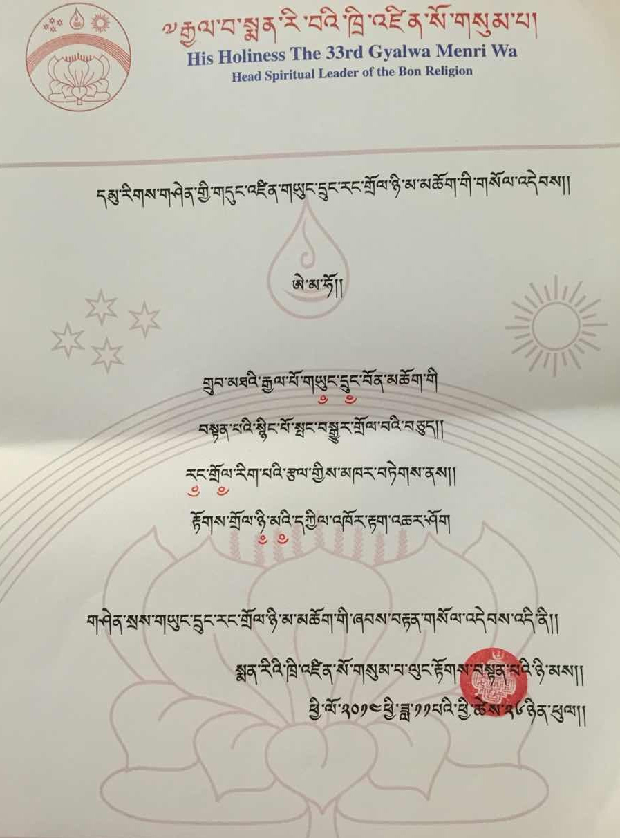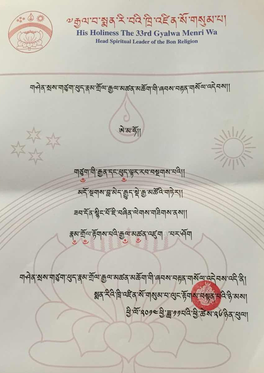 “Tsangpa Tsukpü, Listen! Anyone who has entered the door of the Bön of the genyen who rises in the morning between dawn and sunrise and purifies with lustral water, worships the the three supports of the enlightened ones and the five deities, he or she will be liberated from the bondage of the five realms of cyclic existence.”