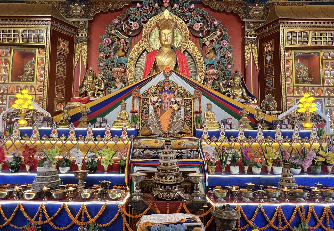 Within a completely pure and unchanging miraculous realm is the spiritual master, the essence of the Enlightened Ones of the three times. In order for the migrating beings of the six destinies to cross the ocean of cyclic existence, please remain seated upon the jeweled throne, upon faultless cushions of a radiant lotus, sun, and moon within the unsurpassed palace of the immeasurable three places! AH OM HUNG CHI PAR RAYNA TA TSEN RA YO DZA